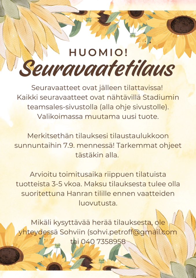 Etusivu Hankasalmen Ratsastajat ry Hankasalmen Ratsastajat on vuonna 1988 perustettu Hankasalmen ratsastuskoululla majapaikkaa pitävä keskisuomalainen ratsastusseura. Tarjoamme laadukasta seuratoimintaa kaikenikäisille hevosista ja ratsastuksesta kiinnostuneille Ajankohtaista 6.-7.9.2025 SadonkorjuuviikonloppuHankasalmen Ratsastuskoululla. Seuravaatteet tilattavissa 7.9.2025 astiKaikki seuravaatteet hintoineen ovat nähtävillä osoitteessa www.stadiumteamsales.fi/seurat/3000563Tilauslomake Tervetuloa mukaan toimintaamme Yhdistys Jäsenyys Tapahtumat Yhteystiedot © All Rights Reserved.